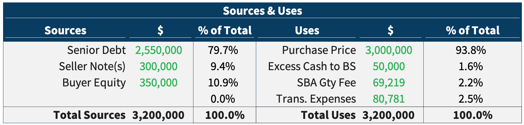 Consider a hypothetical: A buyer finds a business right in the sweet spot for a self-funded searcher: $750K EBITDA at a 4.0x multiple ($3.0M purchase price). Further assume a popular 80/10/10 structure – 80% SBA debt, 10% Seller Note, and 10% equity. The final sources and uses of funds might look something like this: